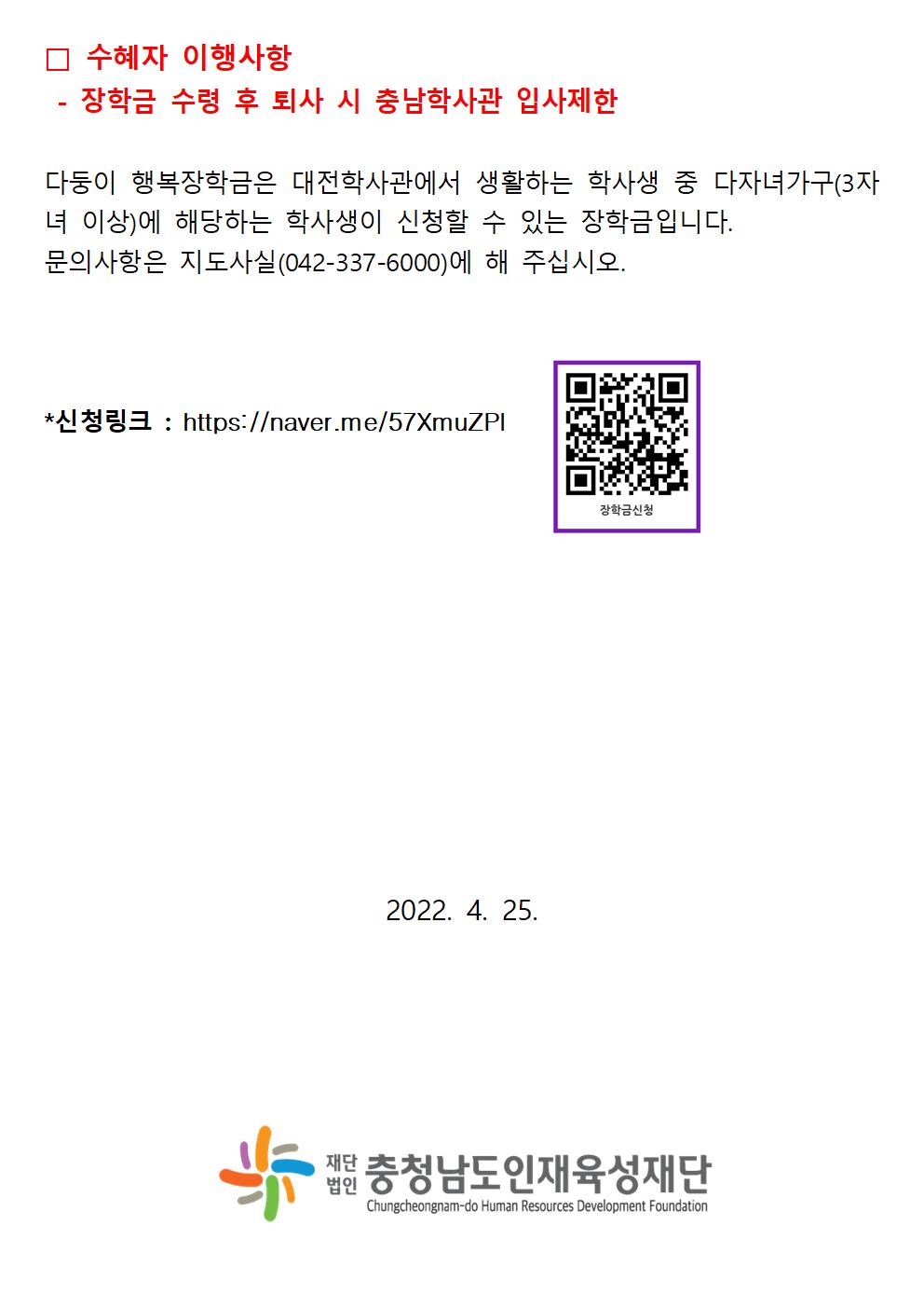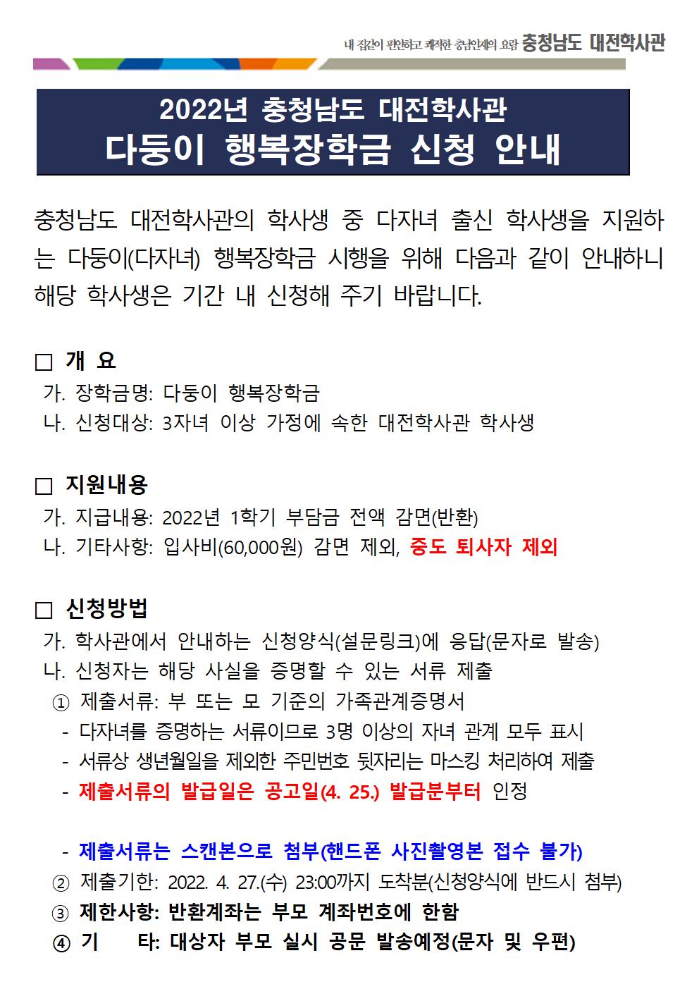 [알림] 2022년 충청남도 대전학사관 다둥이행복장학금 신청안내