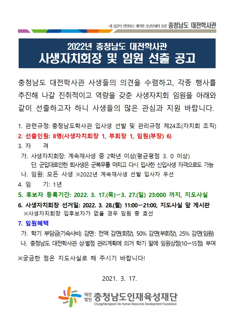[알림] 2022년 충청남도 대전학사관 사생자치회장 및 임원 선출 공고