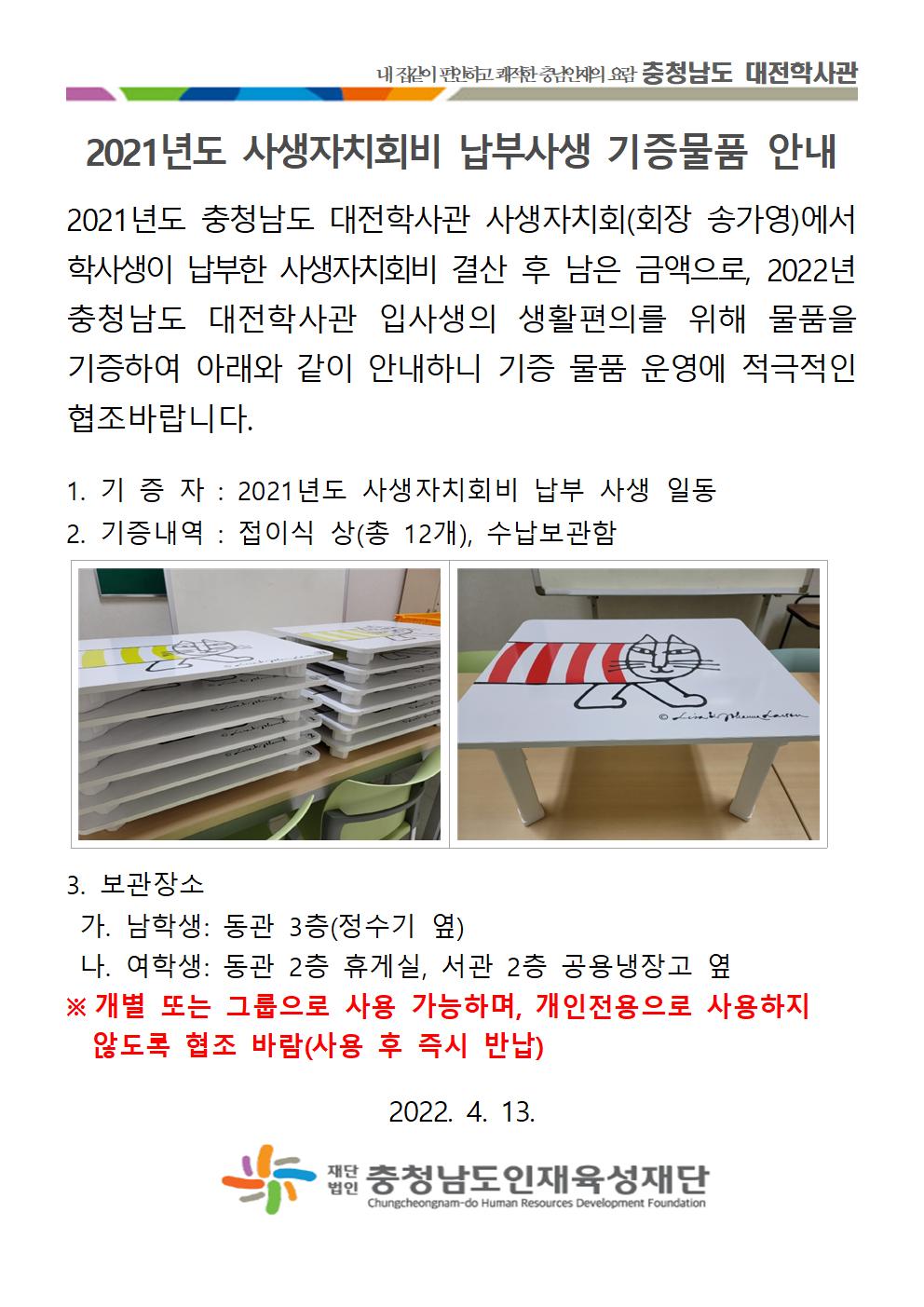 [알림] 2021년도 충청남도 대전학사관 사생자치회비 납부사생 기증물품 안내