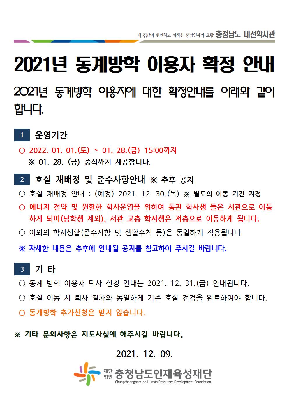 [알림] 2021년 충청남도 대전학사관 2학기 동계방학 이용 확정 안내