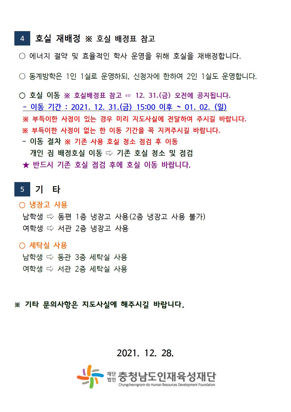 [알림] 2021년 충청남도 대전학사관 동계방학 이용자 준수사항 및 호실 재배정 안내