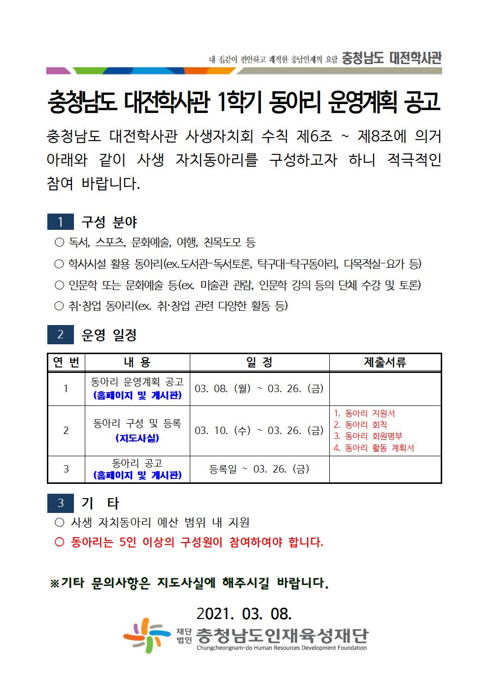 [알림] 2021년 충청남도 대전학사관 1학기 동아리 운영계획 안내