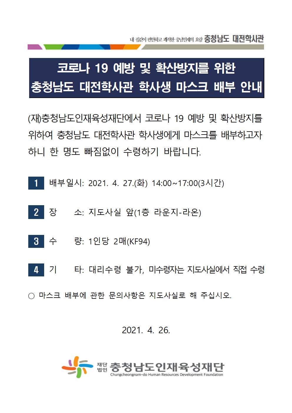 코로나 19 예방 및 확산방지를 위한 충청남도 대전학사관 학사생 마스크 배부 안내001.jpg