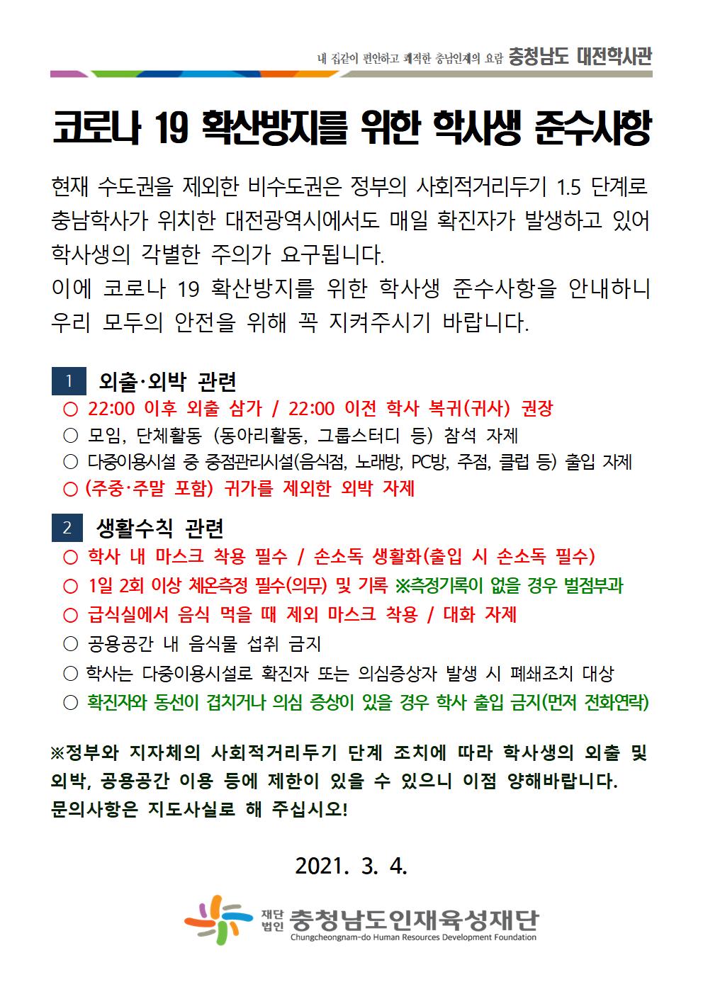[필독] 충청남도 대전학사관 코로나 19 확산방지를 위한 학사생 준수사항