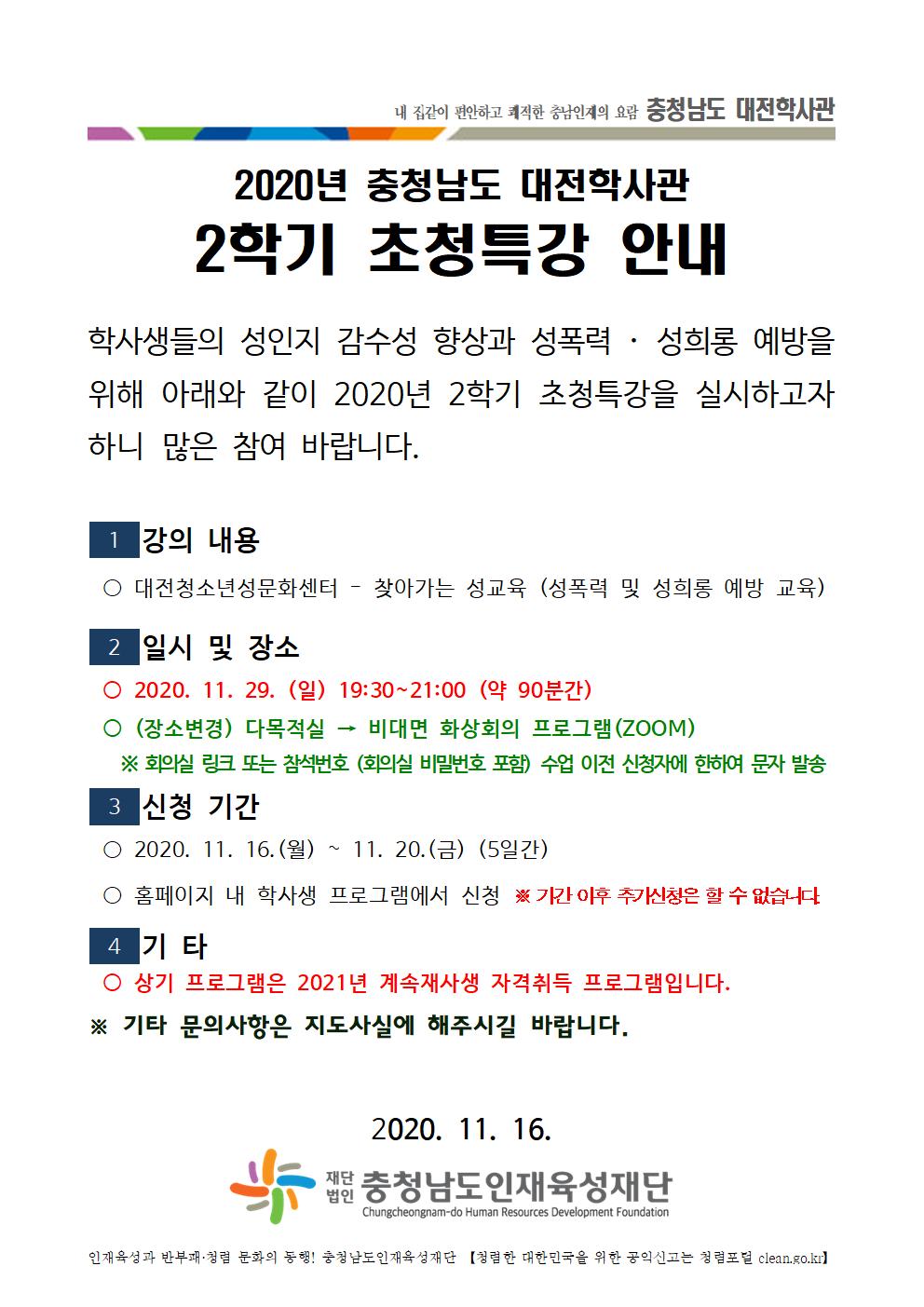 [알림] (변경)충청남도 대전학사관 2020년 2학기 초청특강(성폭력 및 성희롱 예방교육) 실시