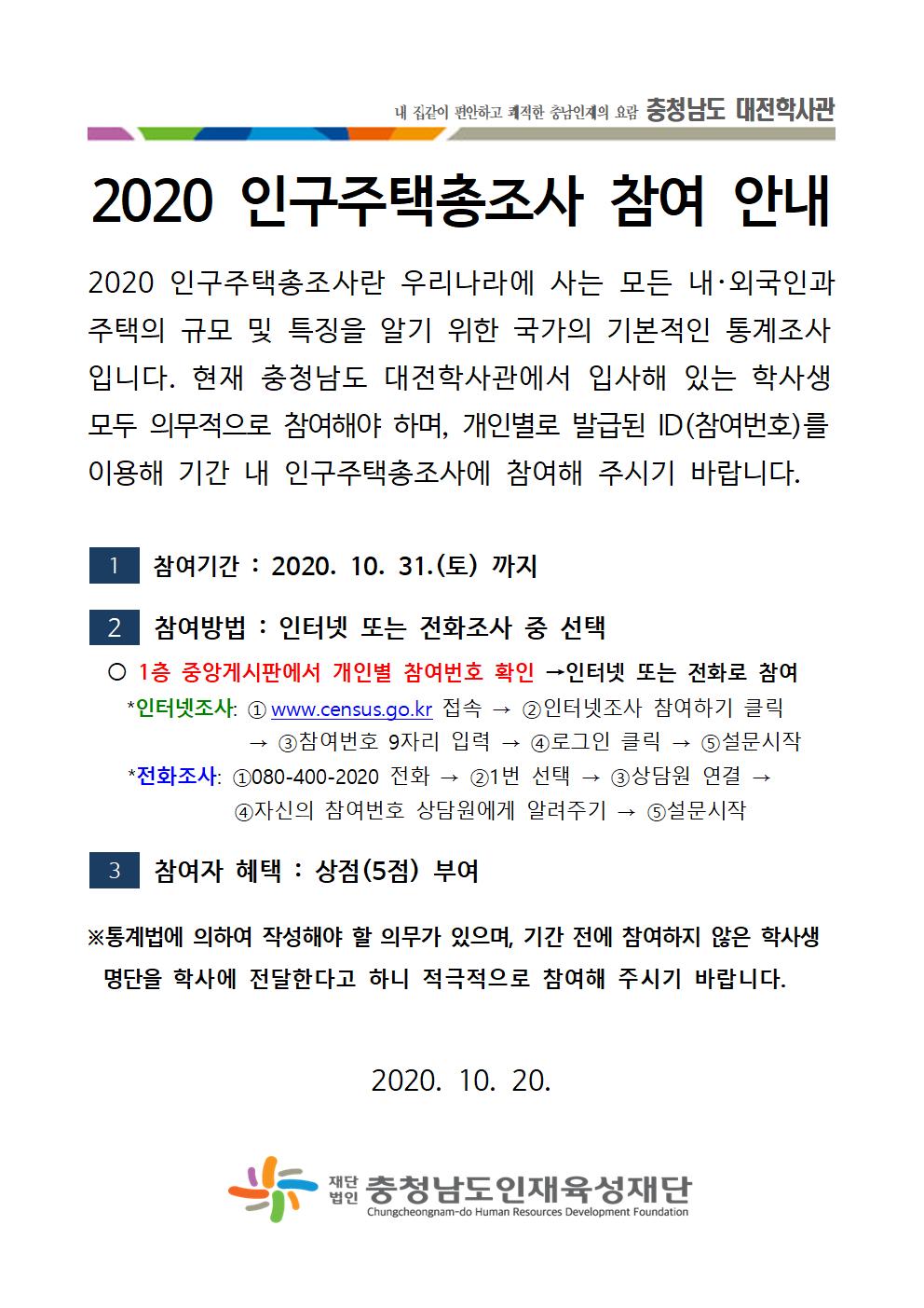 [알림] 충청남도 대전학사관 2020 인구주택총조사 참여 안내
