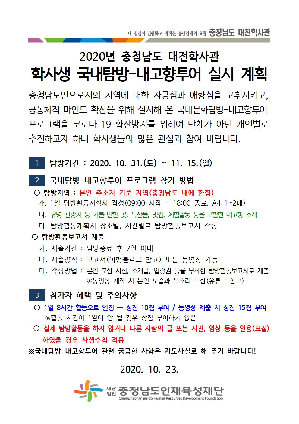 2020년 충청남도 대전학사관 국내탐방-내고향투어 실시 계획(안내문)001.jpg