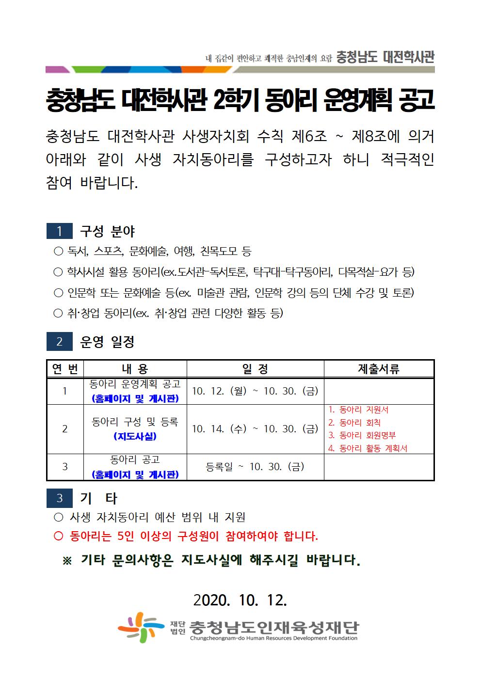 [알림] 충청남도 대전학사관 2학기 동아리 운영 계획 안내