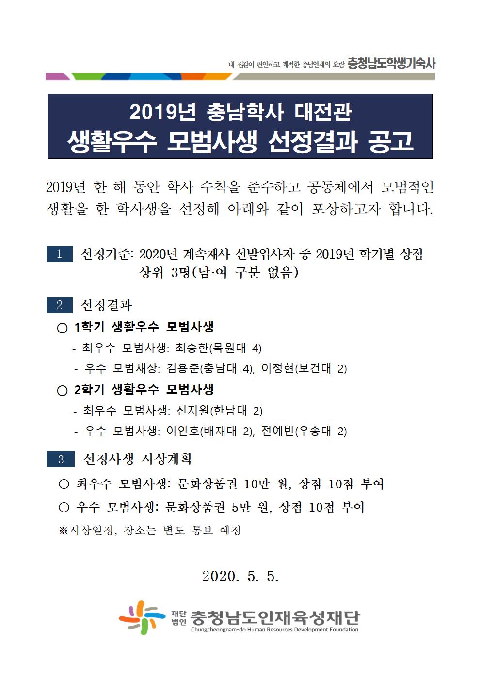 2019년 충남학사 대전관 생활우수 모범사생 선정 공고001.jpg