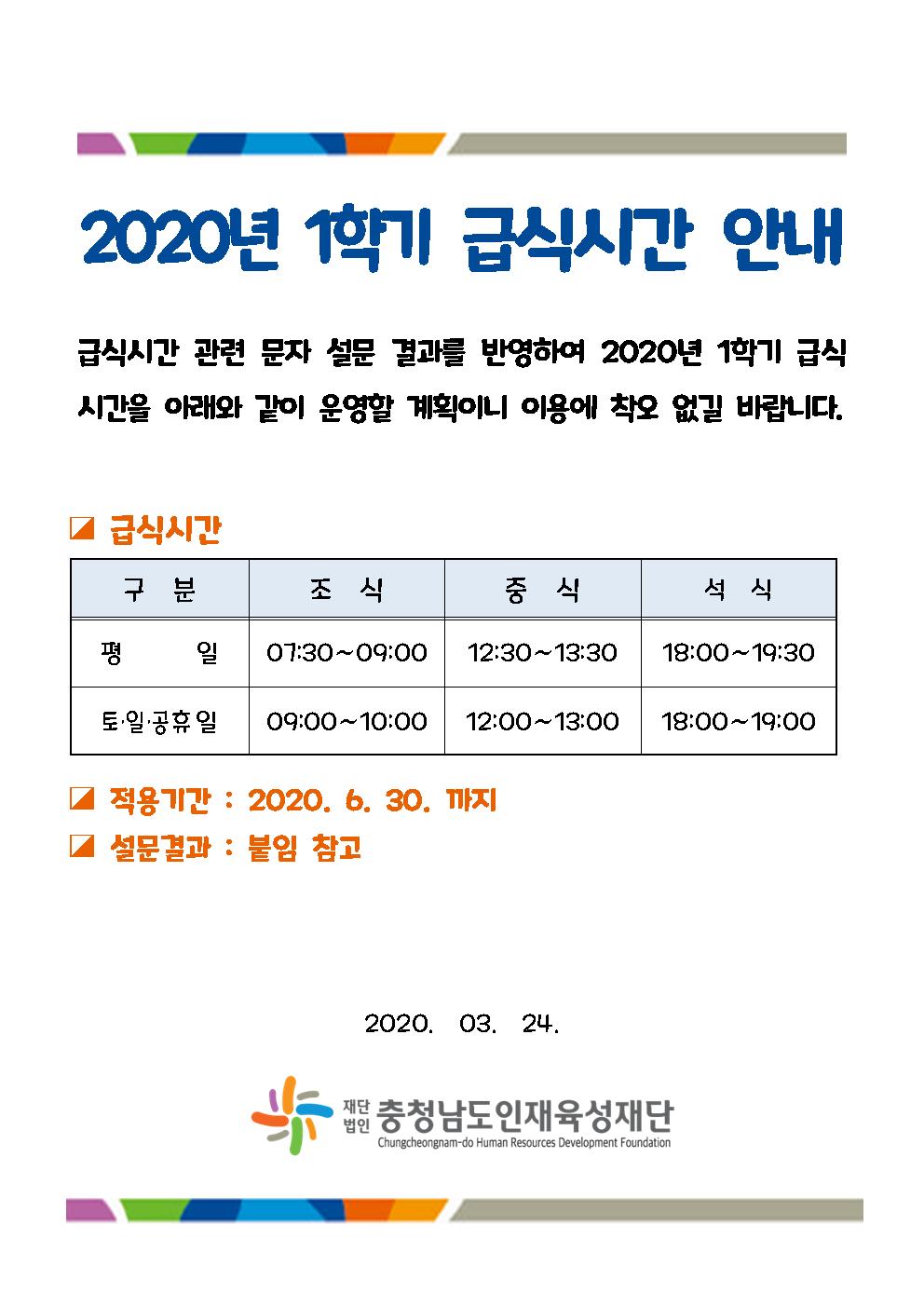 [알림] 2020년 1학기 충남학사 대전관 급식시간 안내