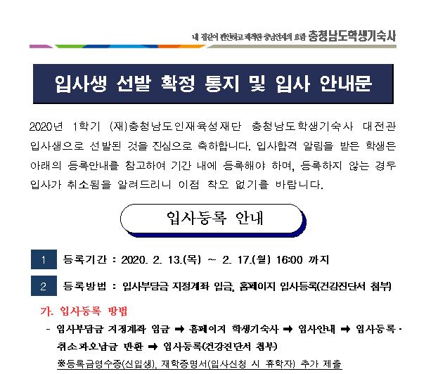 [알림] 2020년 충남학사 대전관 추가모집(남) 선발확정자 입사등록 안내