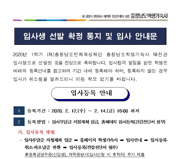[알림] 2020년 충남학사 대전관 입사생 선발 예비후보자(여) 입사등록 안내