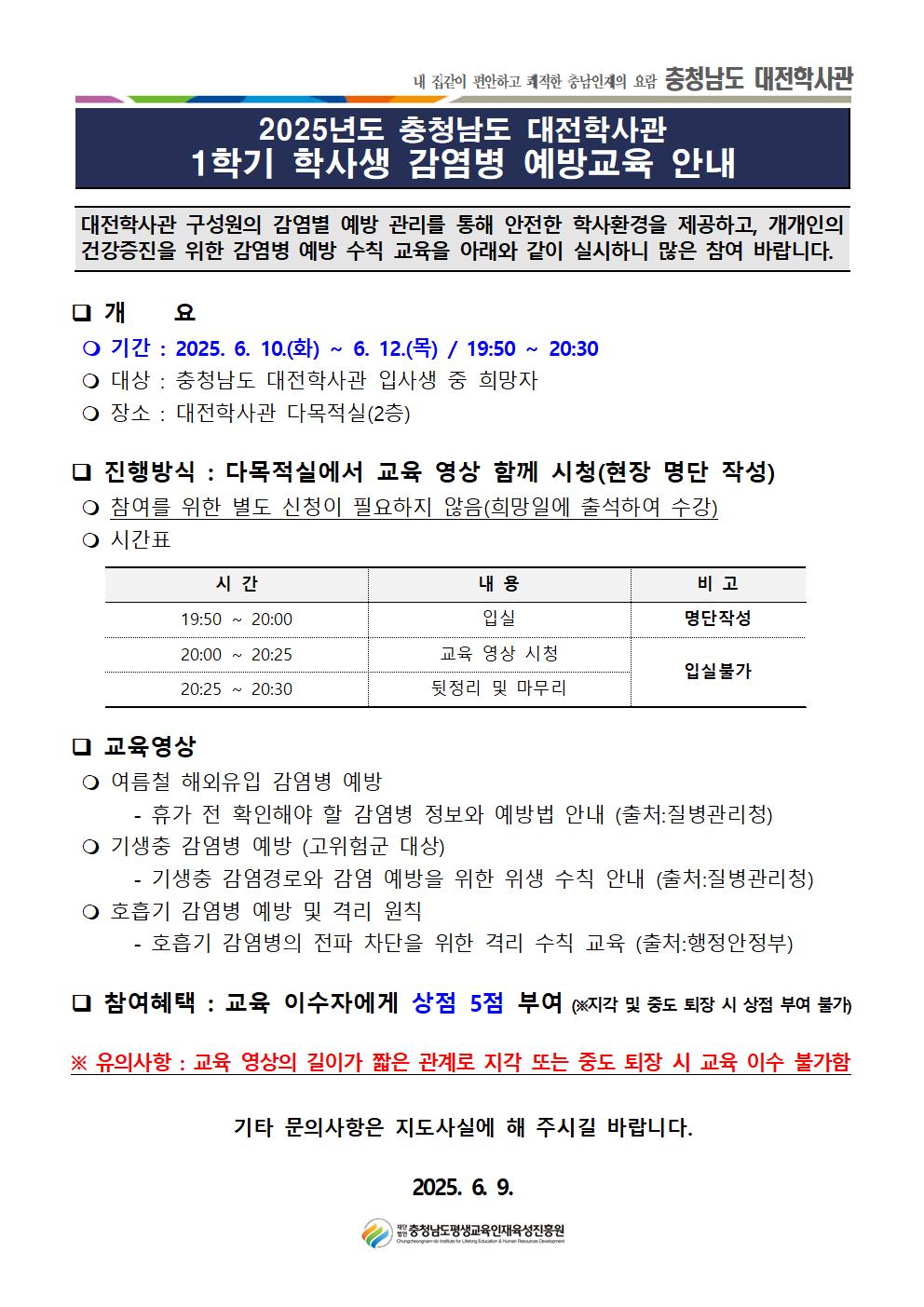 [알림] 2025년도 충청남도 대전학사관 1학기 학사생 감염병 예방교육 안내