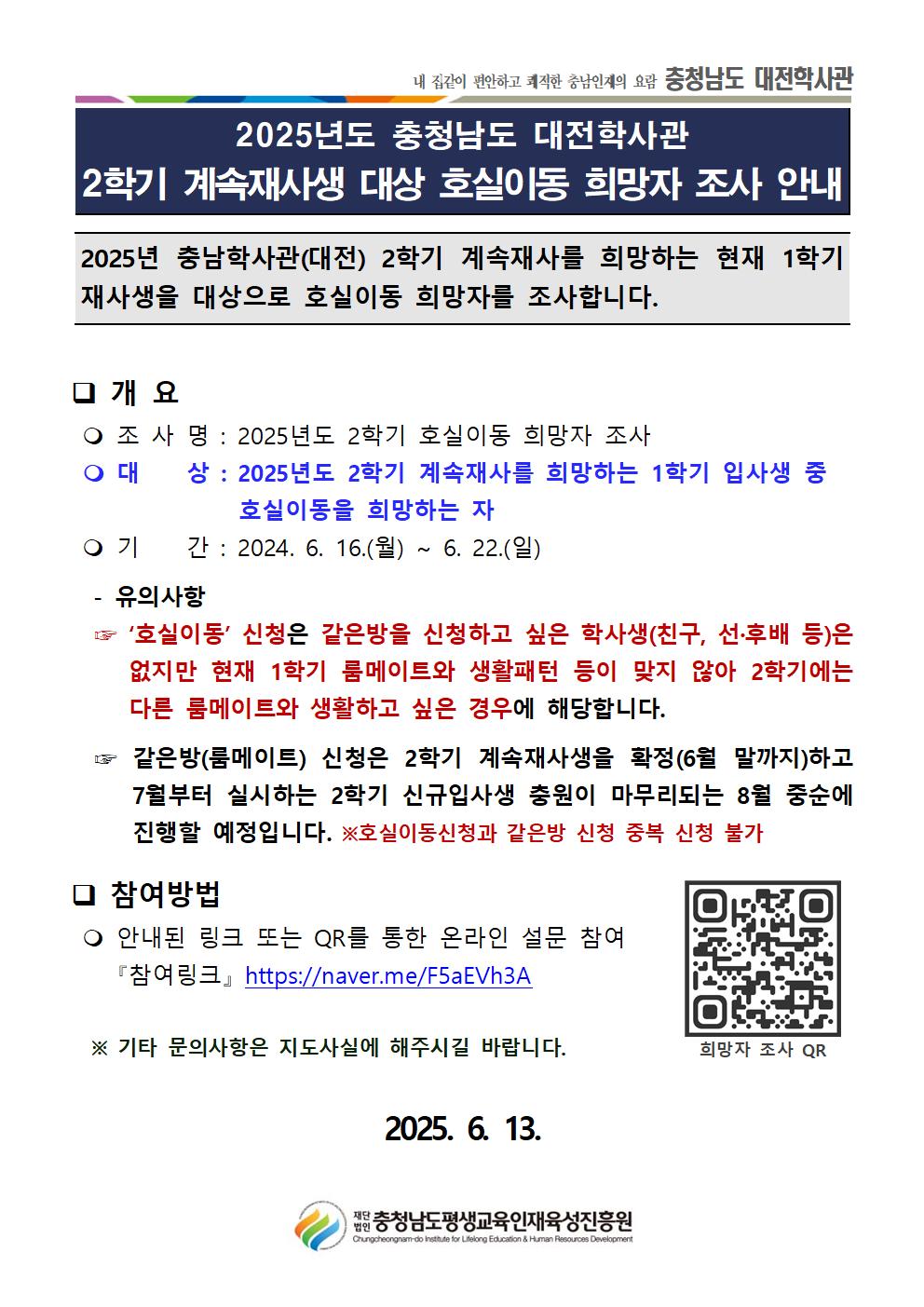 [알림] 2025년도 2학기 계속재사생 대상 호실이동 희망자 조사 실시 안내