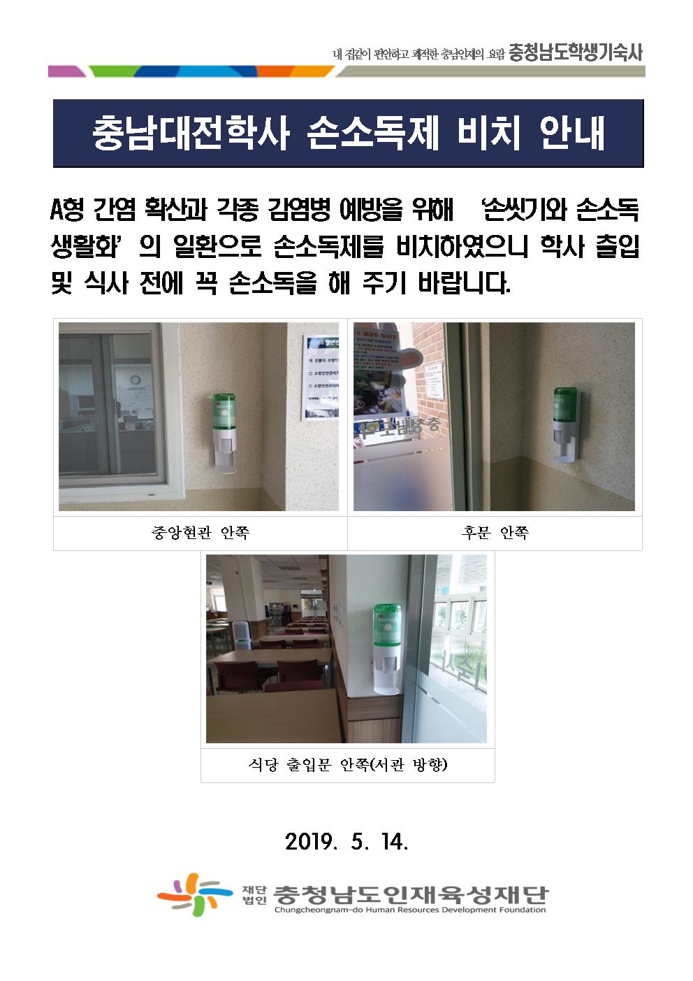 (알림) 충남대전학사 학사생 손소독 생활화를 위한 손소독제 비치 안내