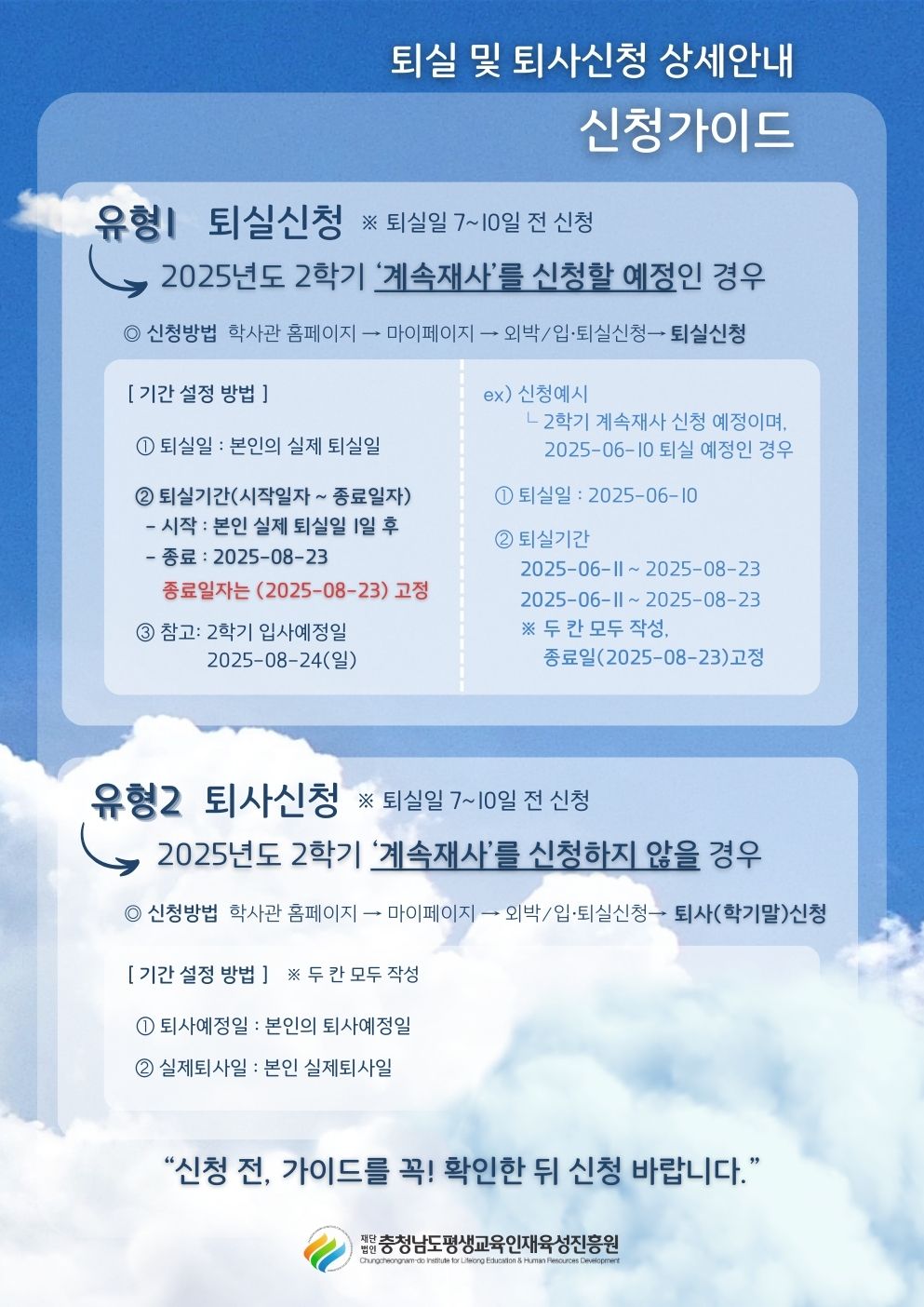 [알림] 2025년도 충청남도 대전학사관 1학기 퇴실 및 퇴사 신청 안내