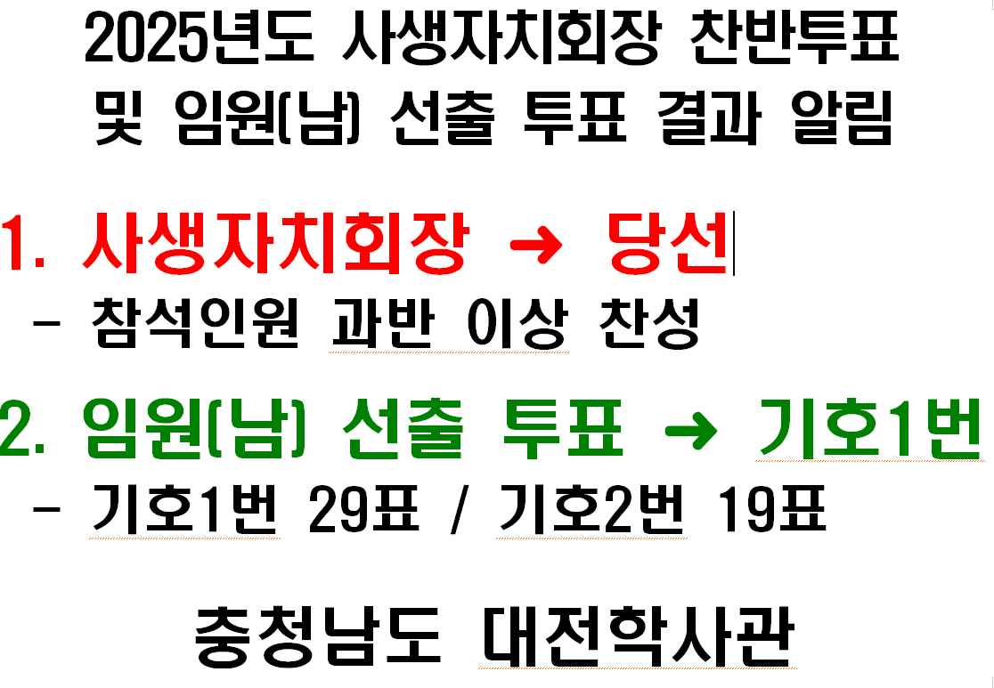 [알림] 2025년도 사생자치회장 찬반투표 및 임원(남) 선출 투표결과 알림