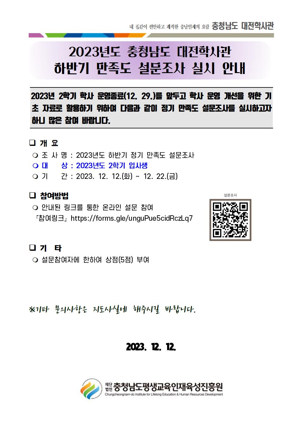 2. 2023년도 충청남도 대전학사관 하반기 만족도 설문조사 실시 안내001.jpg