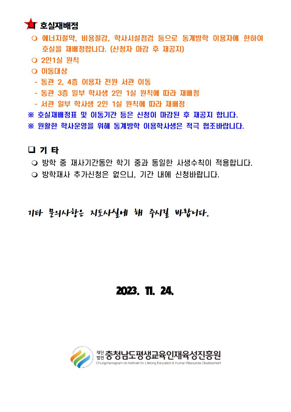 [알림] 2023년도 충청남도 대전학사관 동계방학 운영 및 신청안내