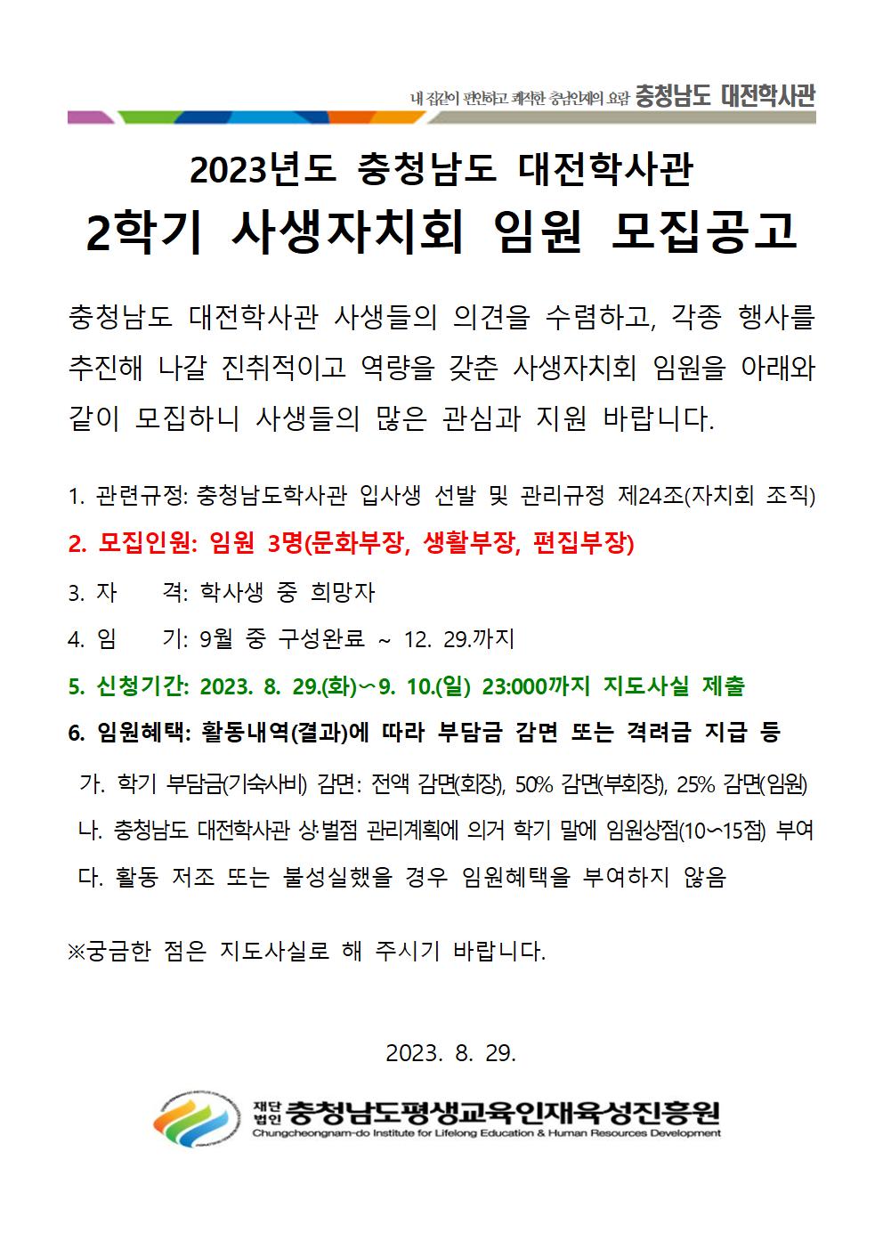 2023년도 충청남도 대전학사관 2학기 사생자치회 임원 모집 공고001.jpg
