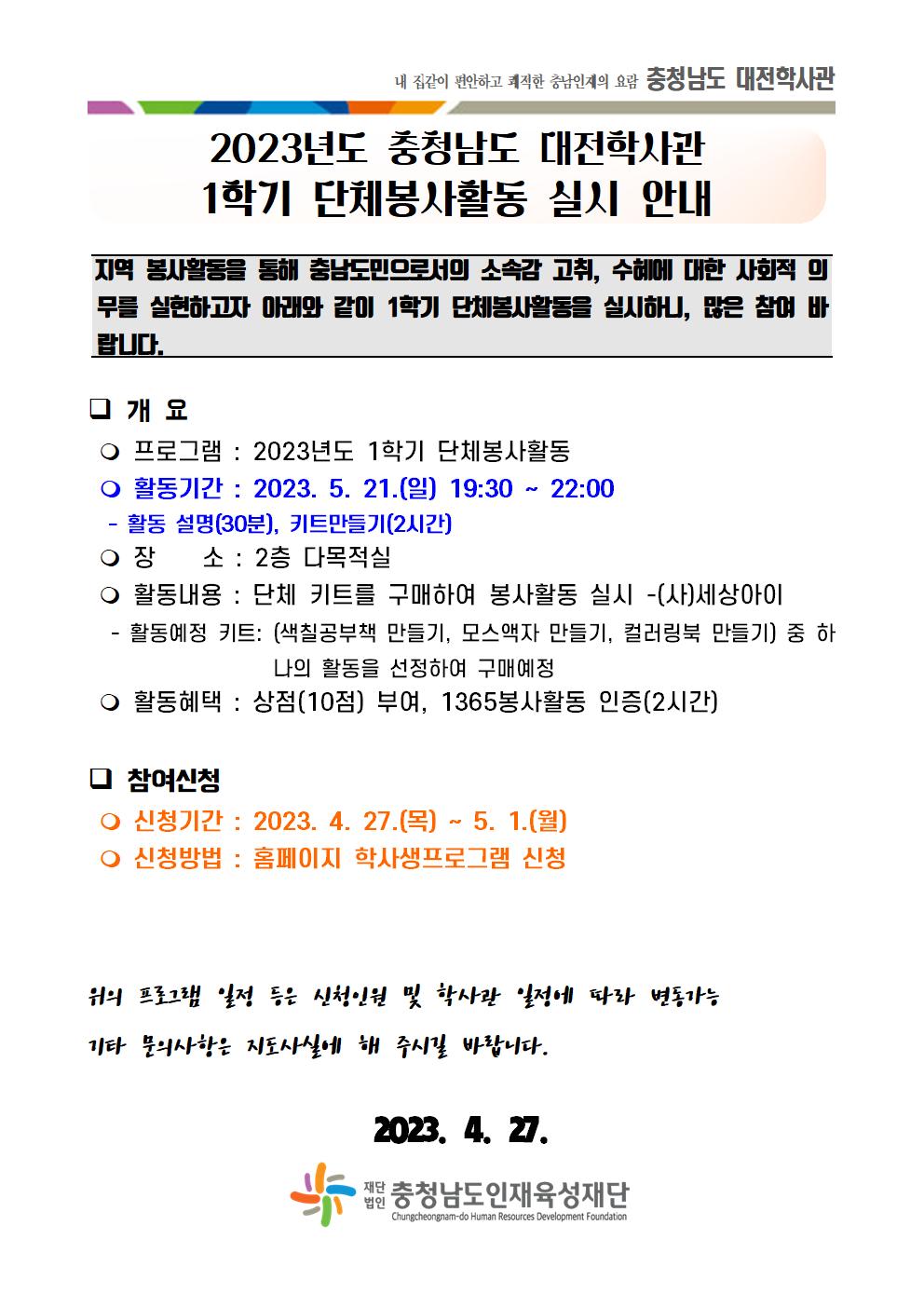 2023년도 충청남도 대전학사관 1학기 단체봉사활동 안내001.jpg