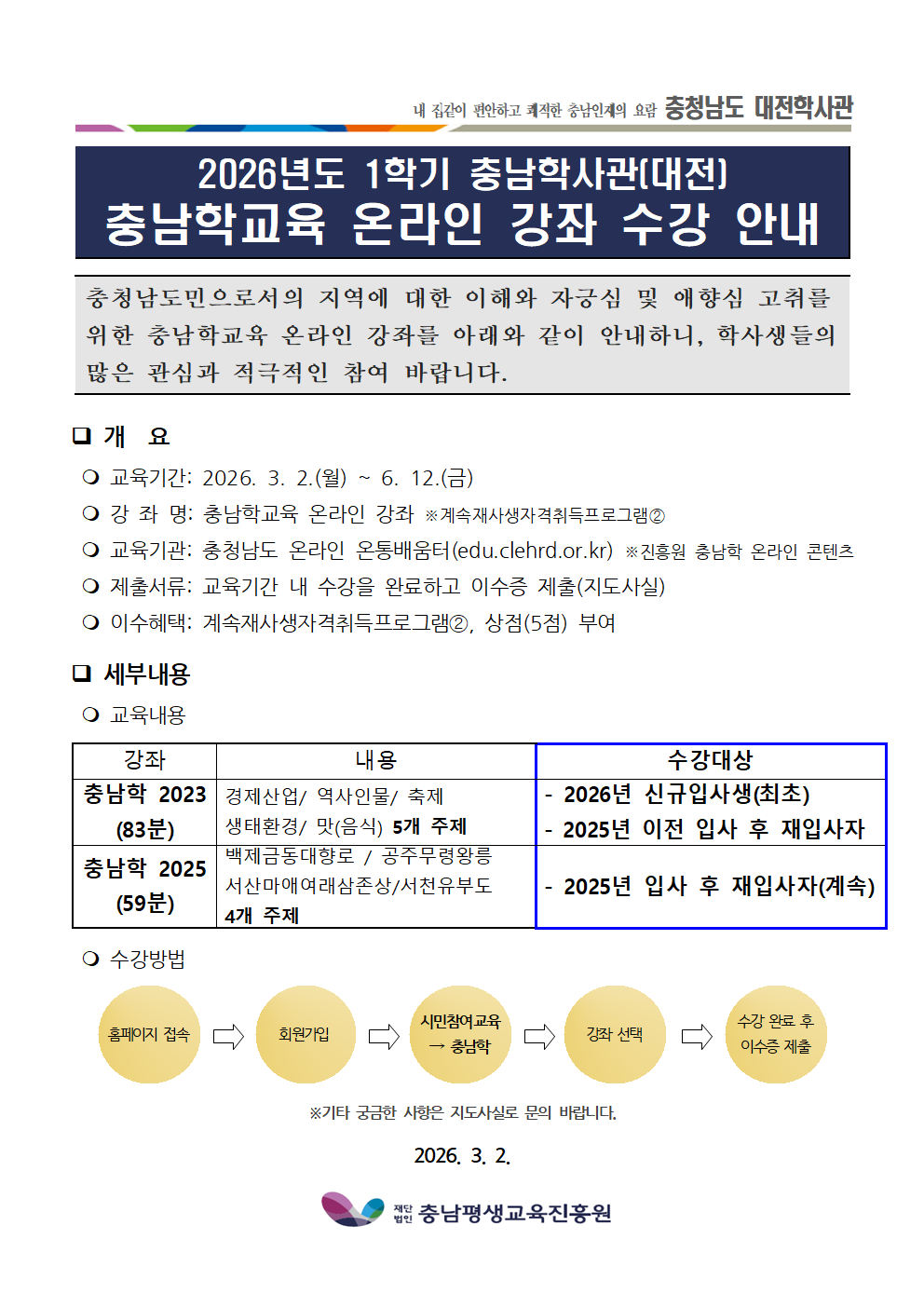 [알림] 2026년도 충남학사관(대전) 1학기 충남학교육 온라인 강좌 수강 안내