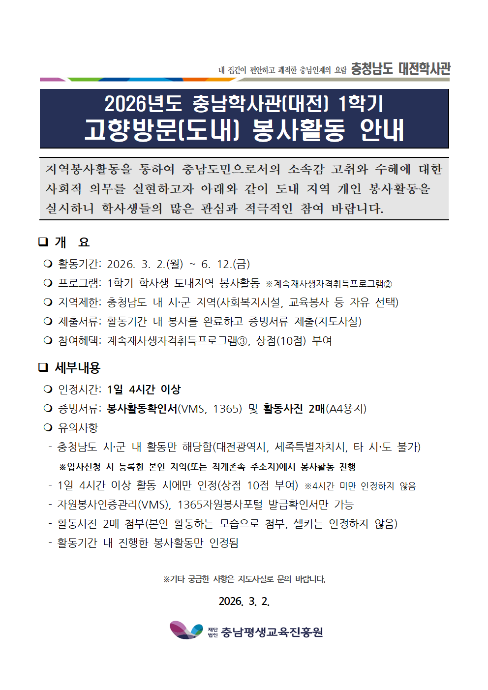 [알림] 2026년도 충남학사관(대전) 1학기 고향방문(도내) 봉사활동 안내