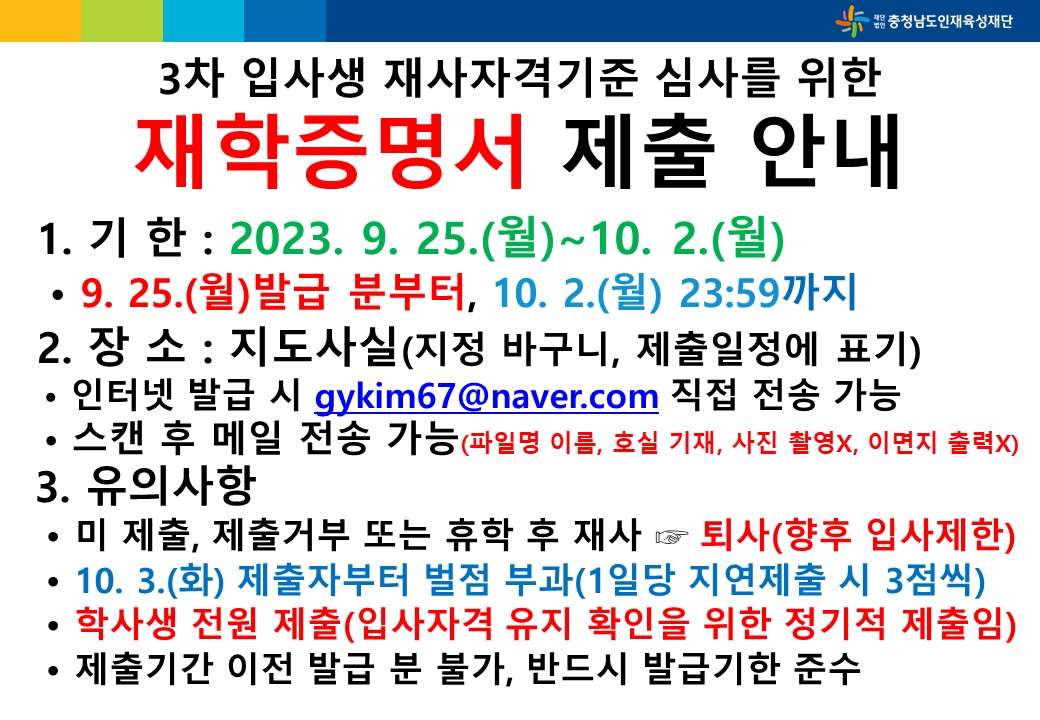 [알림] 3차 입사생 재사자격기준 심사를 위한 재학증명서 제출 안내