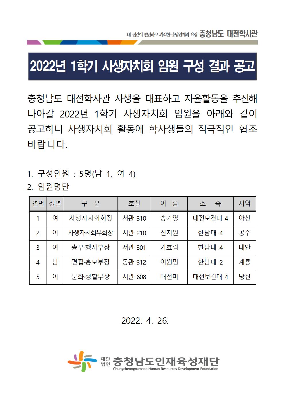 [알림] 2022년 1학기 충청남도 대전학사관 사생자치회 임원구성 결과 공고