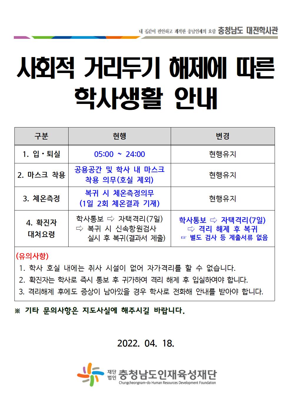 [알림] 충청남도 대전학사관 사회적거리두기 조치 해제에 따른 학사생활 안내