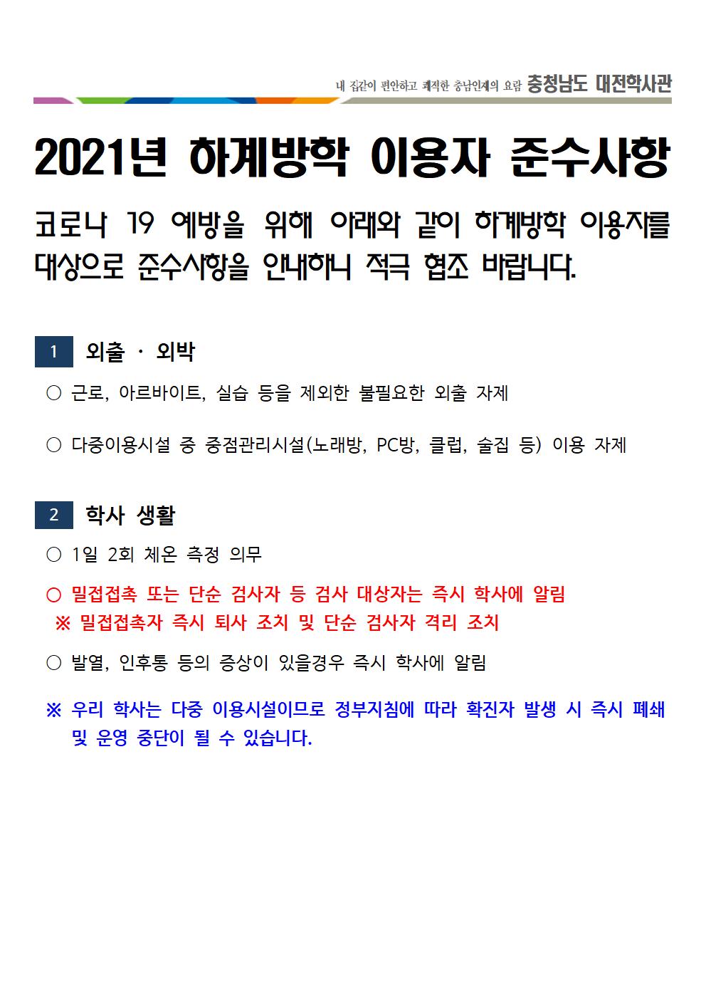 [알림]2021년 충청남도 대전학사관 하계방학 이용자 준수사항 및 호실 재배정 안내