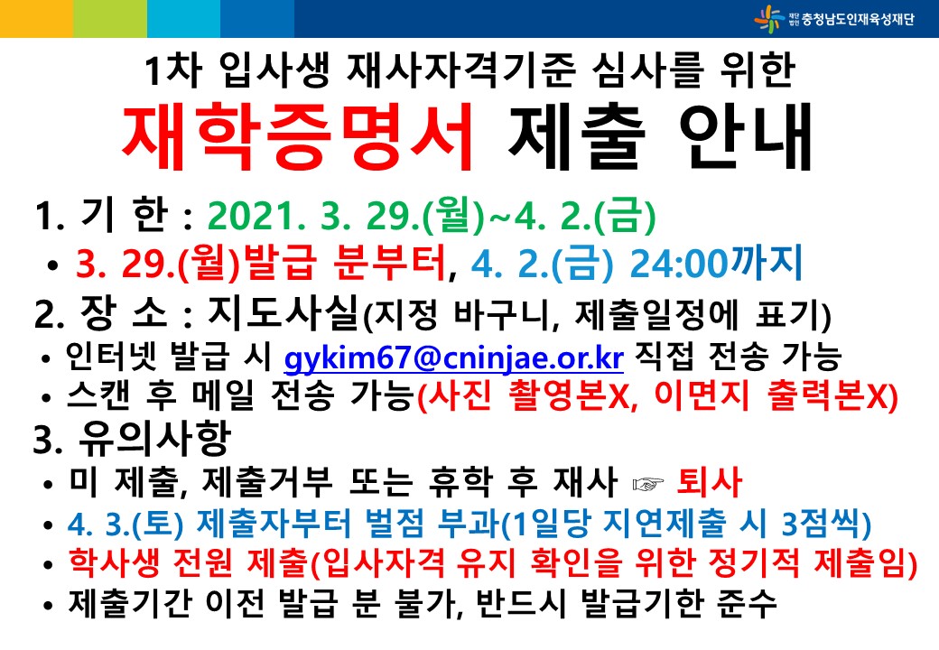 [알림] 1차 입사생 입사자격기준 심사를 위한 재학증명서 제출 안내