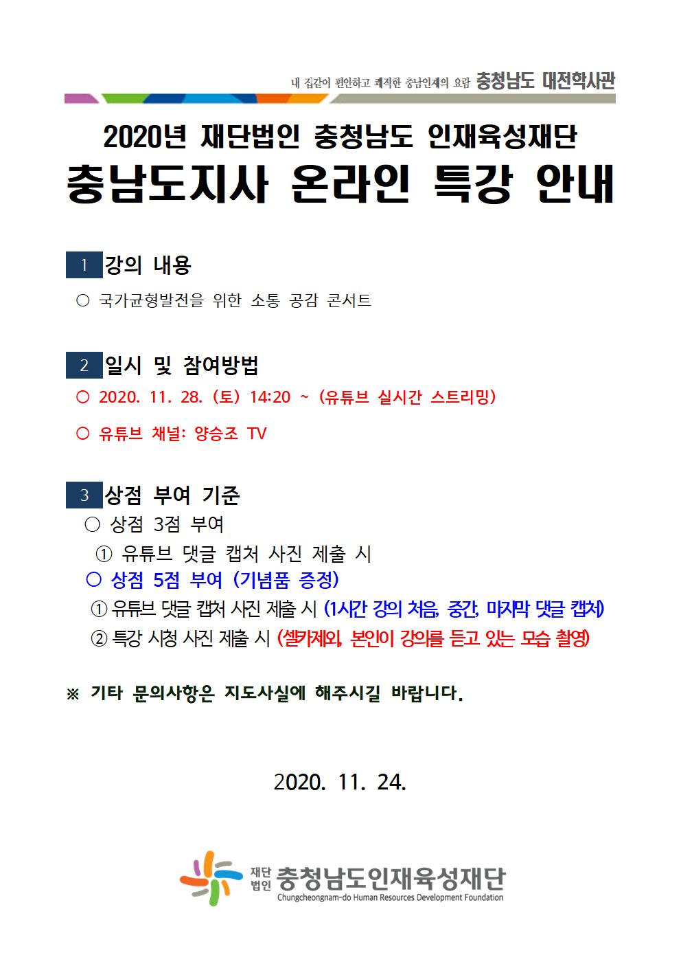 [알림] 충청남도인재육성재단 이사장(도지사 양승조)와 함께하는 온라인 특강 안내