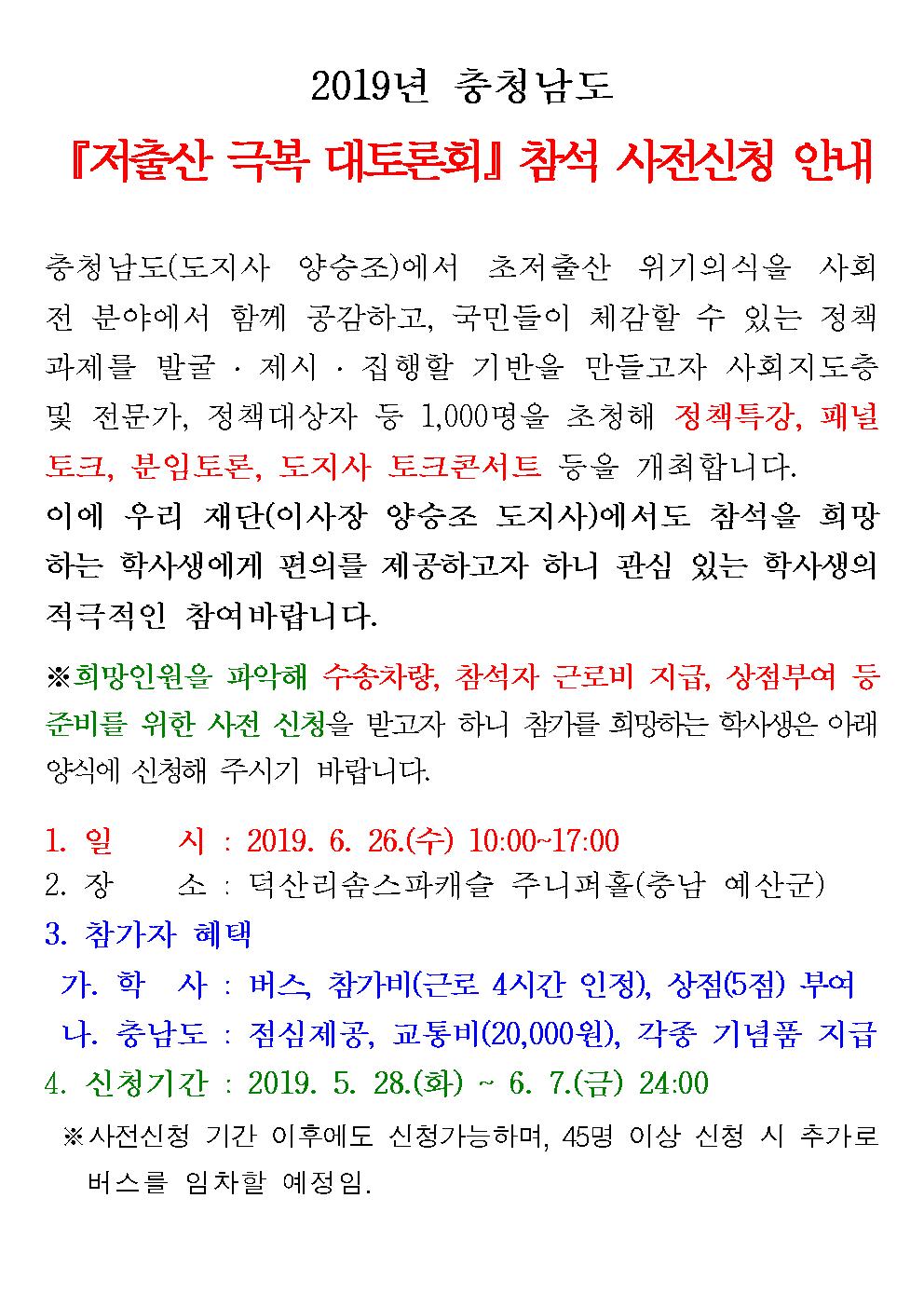 (알림) 2019년 충청남도 저출산 극복 대토론회 참석 사전신청 안내