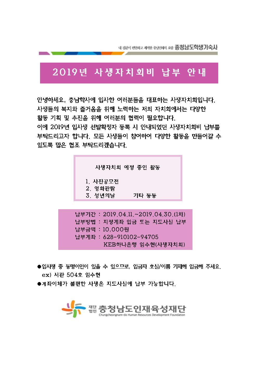 충남학사 사생자치회 활동에 많은 관심과 적극적인 참여 바랍니다.