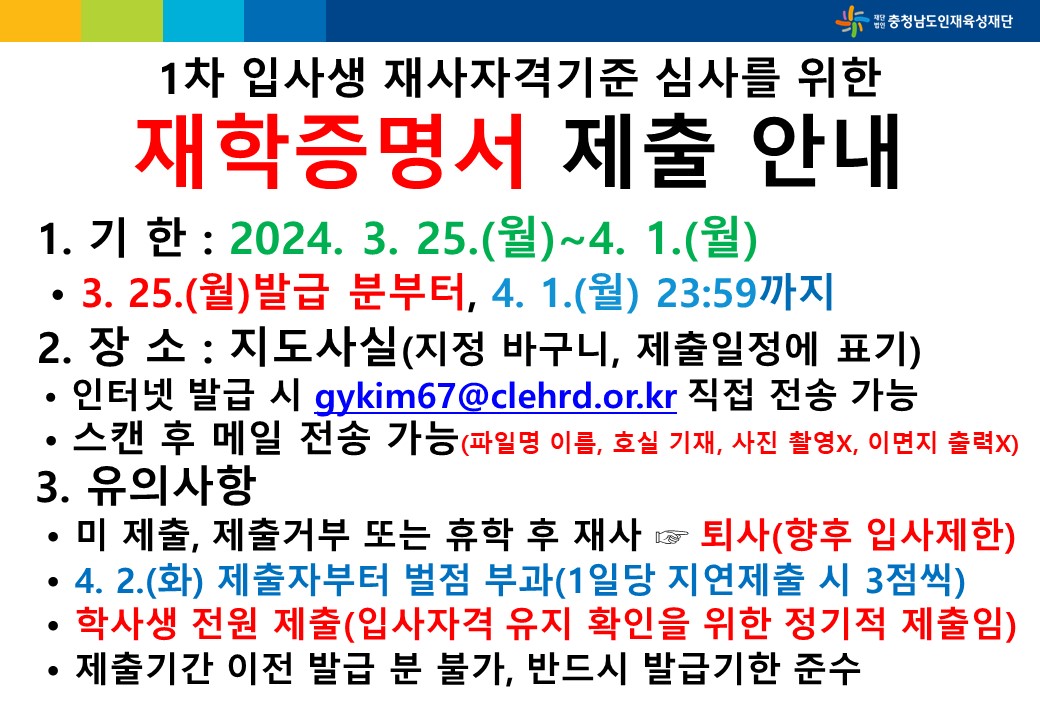 [알림] 1차 입사생 재사자격기준 심사를 위한 재학증명서 제출 안내
