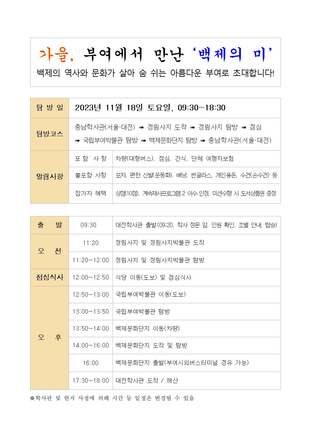 * 도슨트 안내 : 정림사지(11:20), 국립부여박물관(13:00), 백제문화단지(14:00)