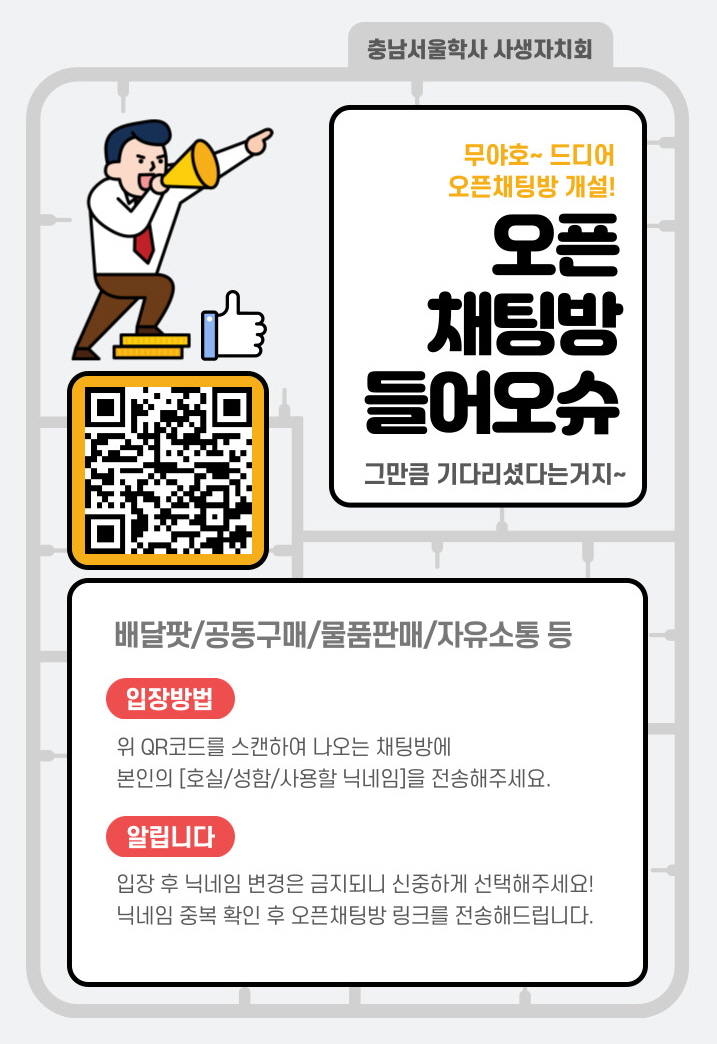 충청남도 서울학사관 사생자치회에서 운영하는 학사생 오픈 채팅방이 개설되었습니다.