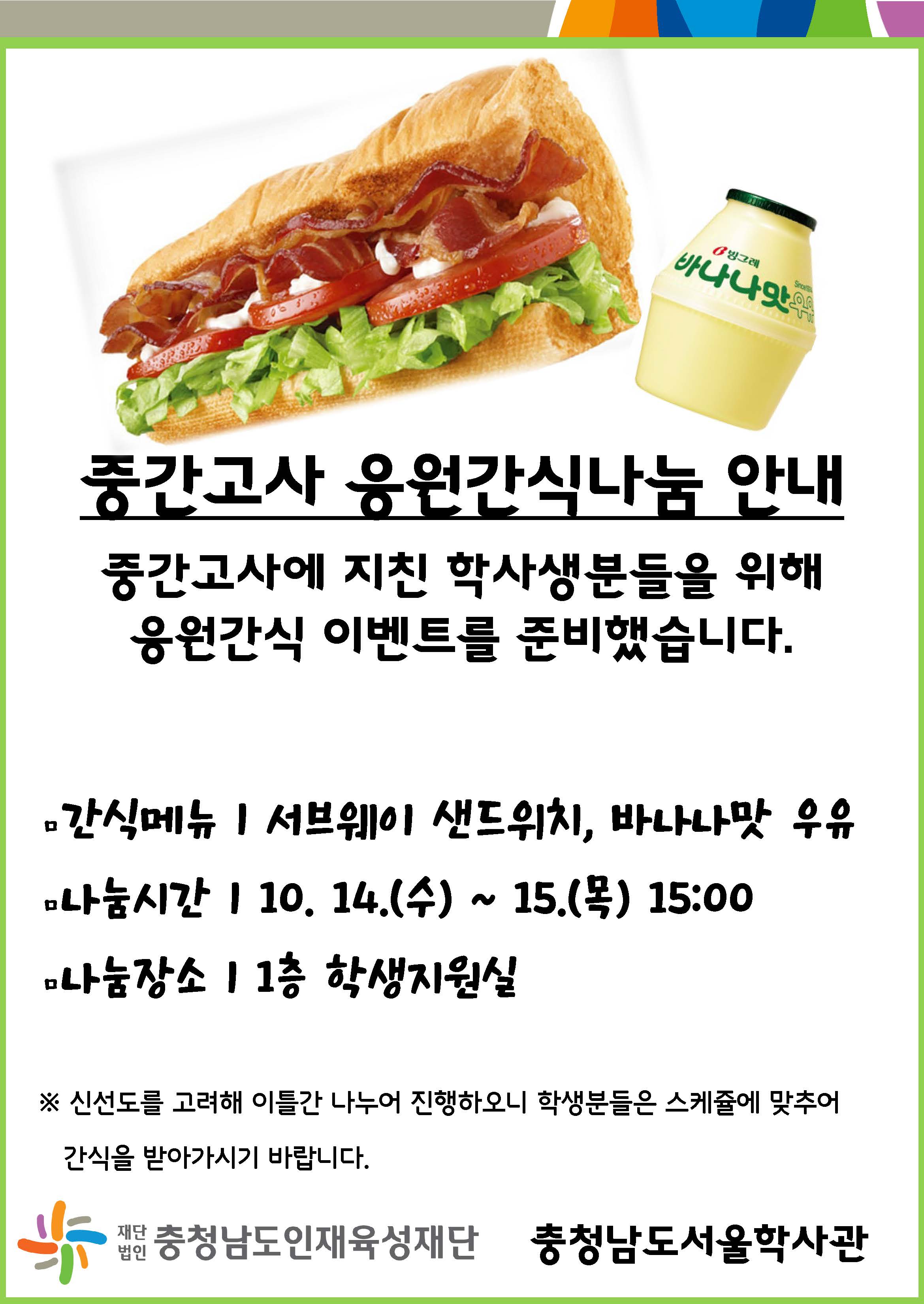 - 해당 간식은 1인 1개씩만 수령이 가능하며 타인(룸메이트) 간식 대리수령 불가
