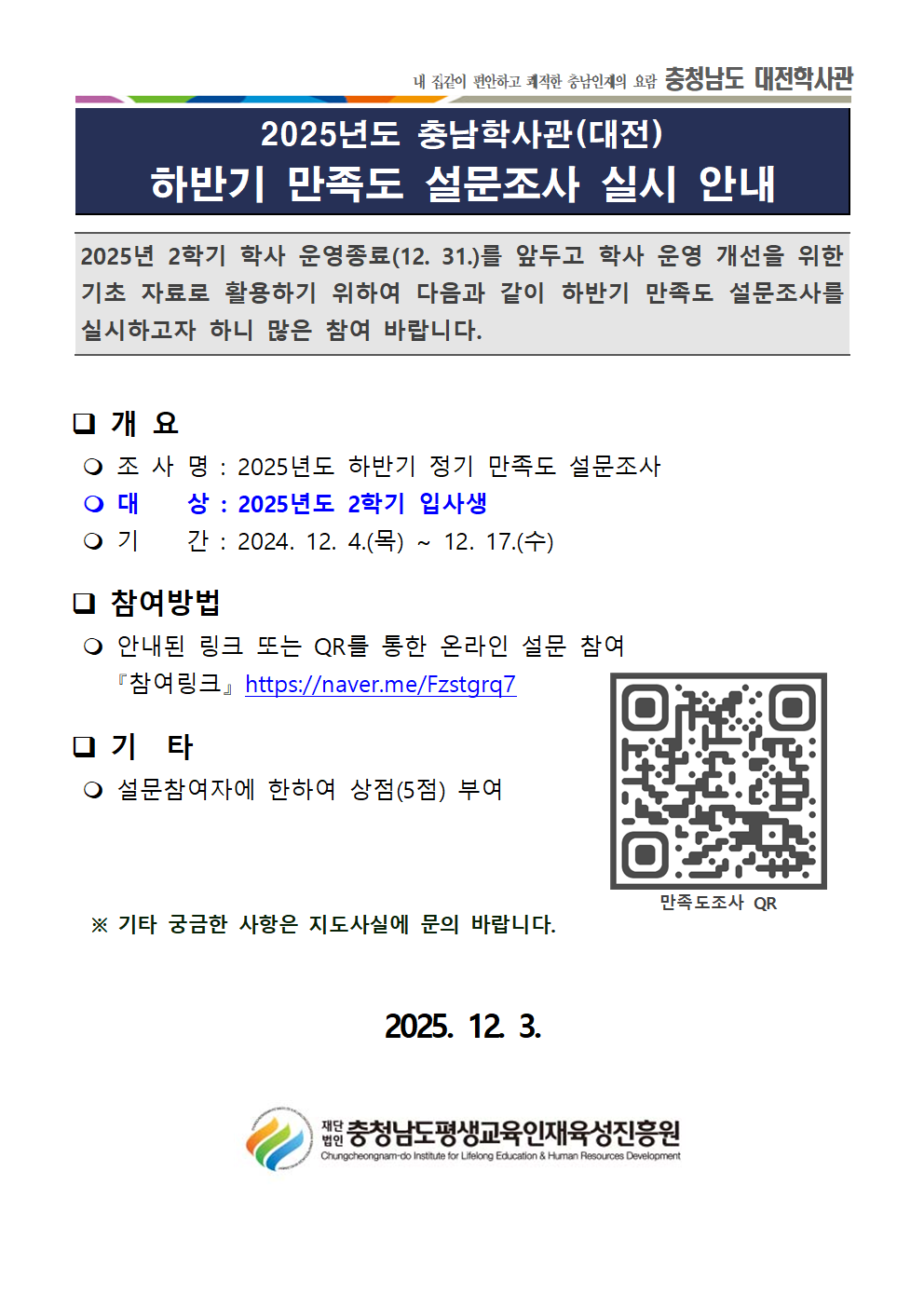 [알림] 2025년도 충남학사관(대전) 하반기 만족도 설문조사 실시 안내