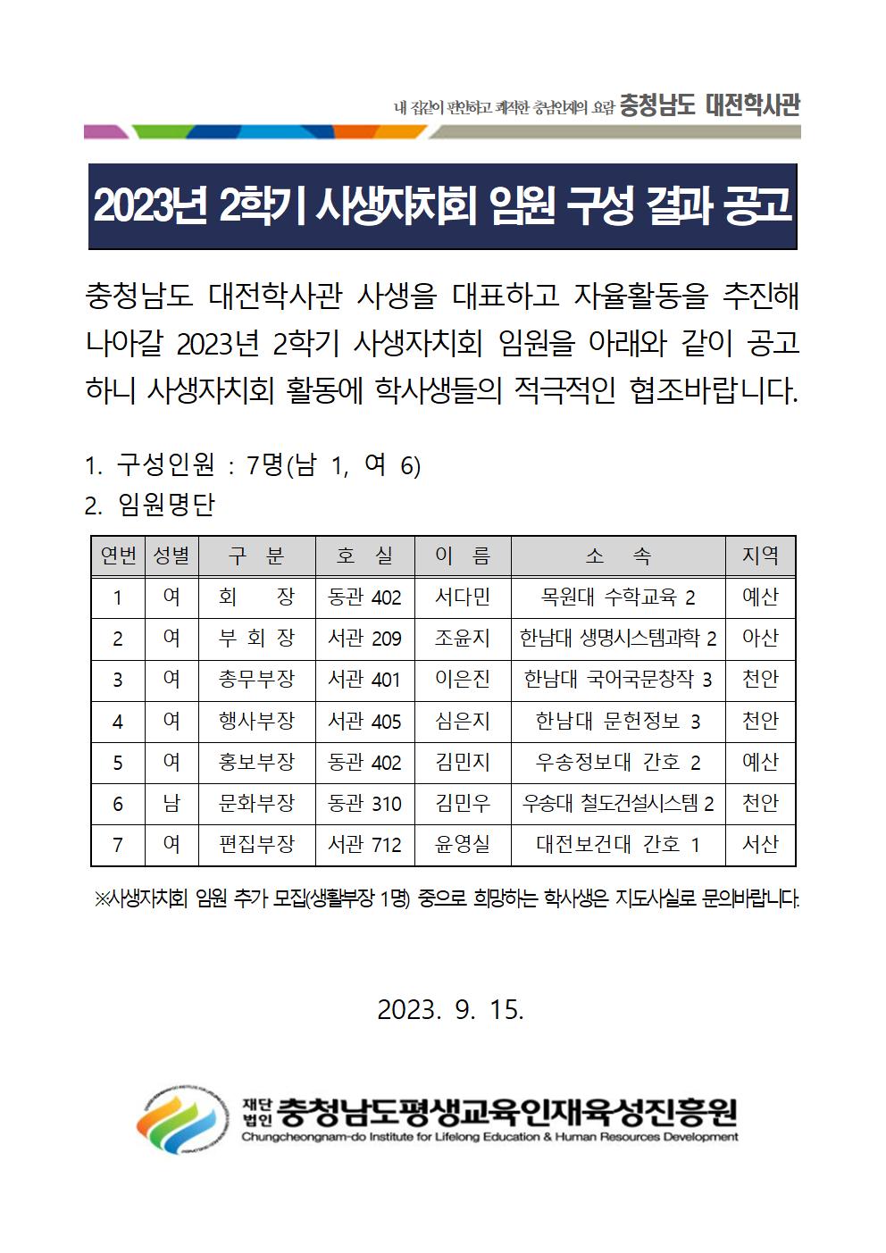 [알림] 2023년도 2학기 충청남도 대전학사관 사생자치회 임원 구성 결과 공고
