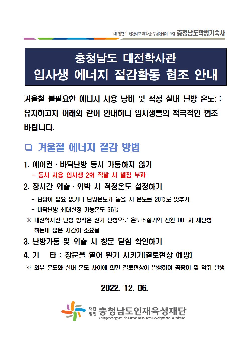 [알림] 2022년 충청남도 대전학사관 입사생 에너지 절감활동 협조 안내