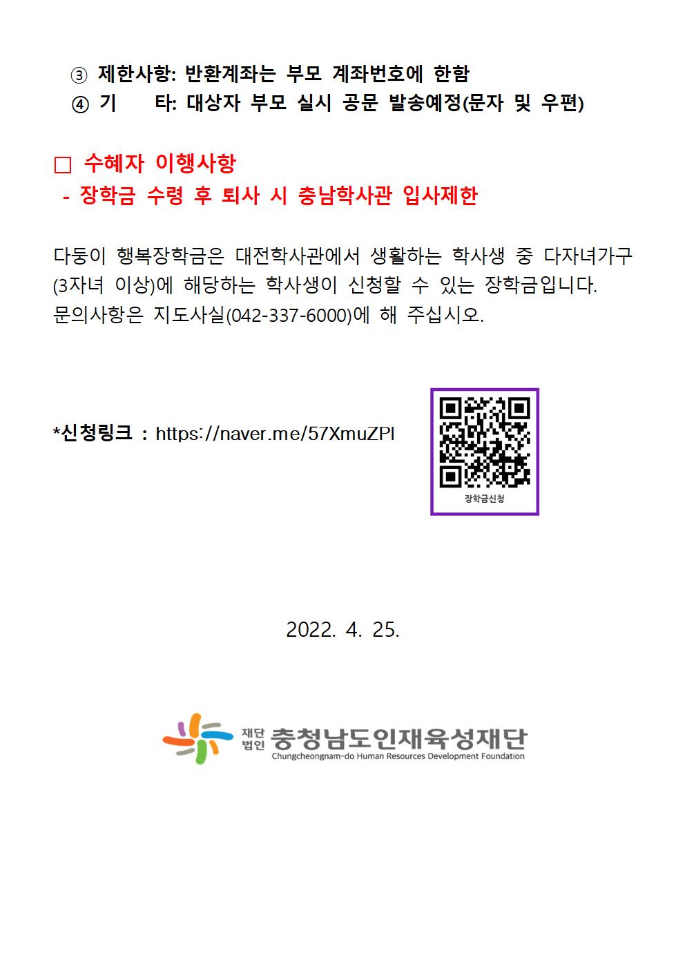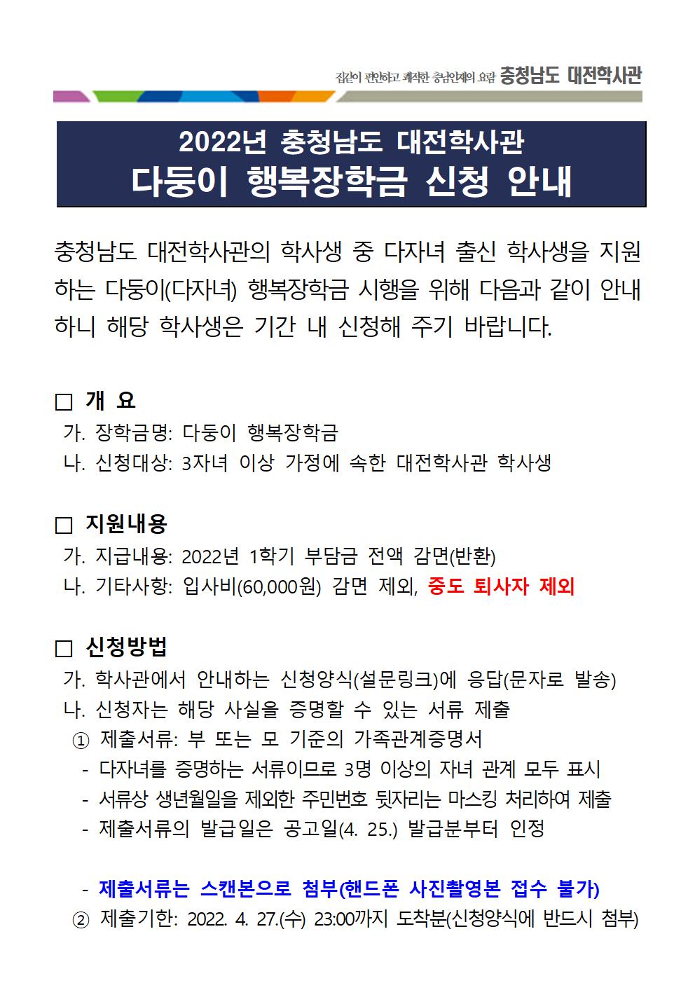 [알림] 2022년 충청남도 대전학사관 다둥이 행복장학금 신청 안내