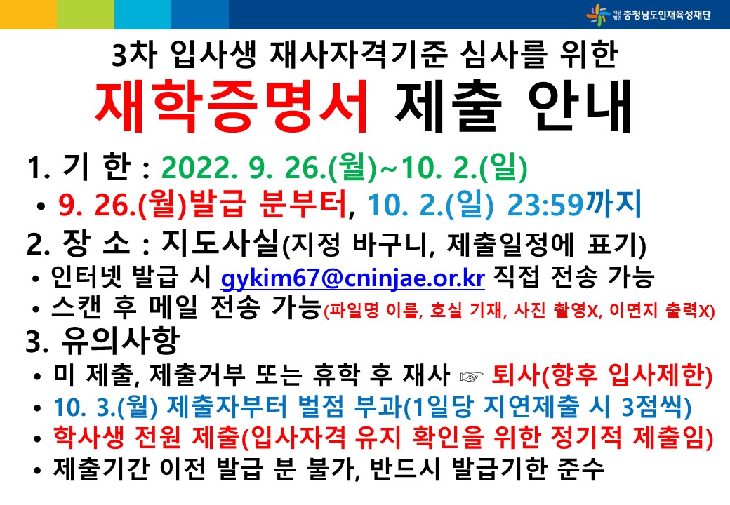 [알림] 3차 입사생 재사자격기준 심사를 위한 재학증명서 제출 안내