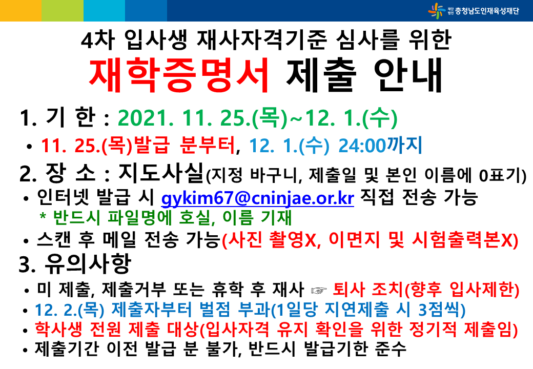 [알림] 4차 입사생 재사자격기준 심사를 위한 재학증명서 제출 안내