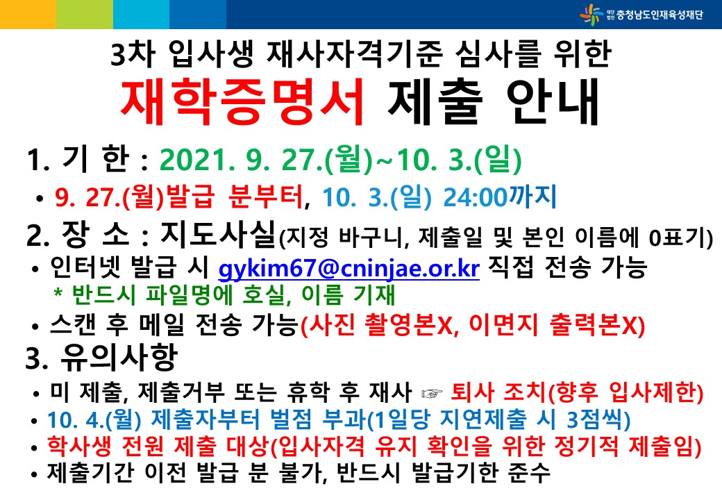 [알림] 3차 입사생 재사자격기준 심사를 위한 재학증명서 제출 안내