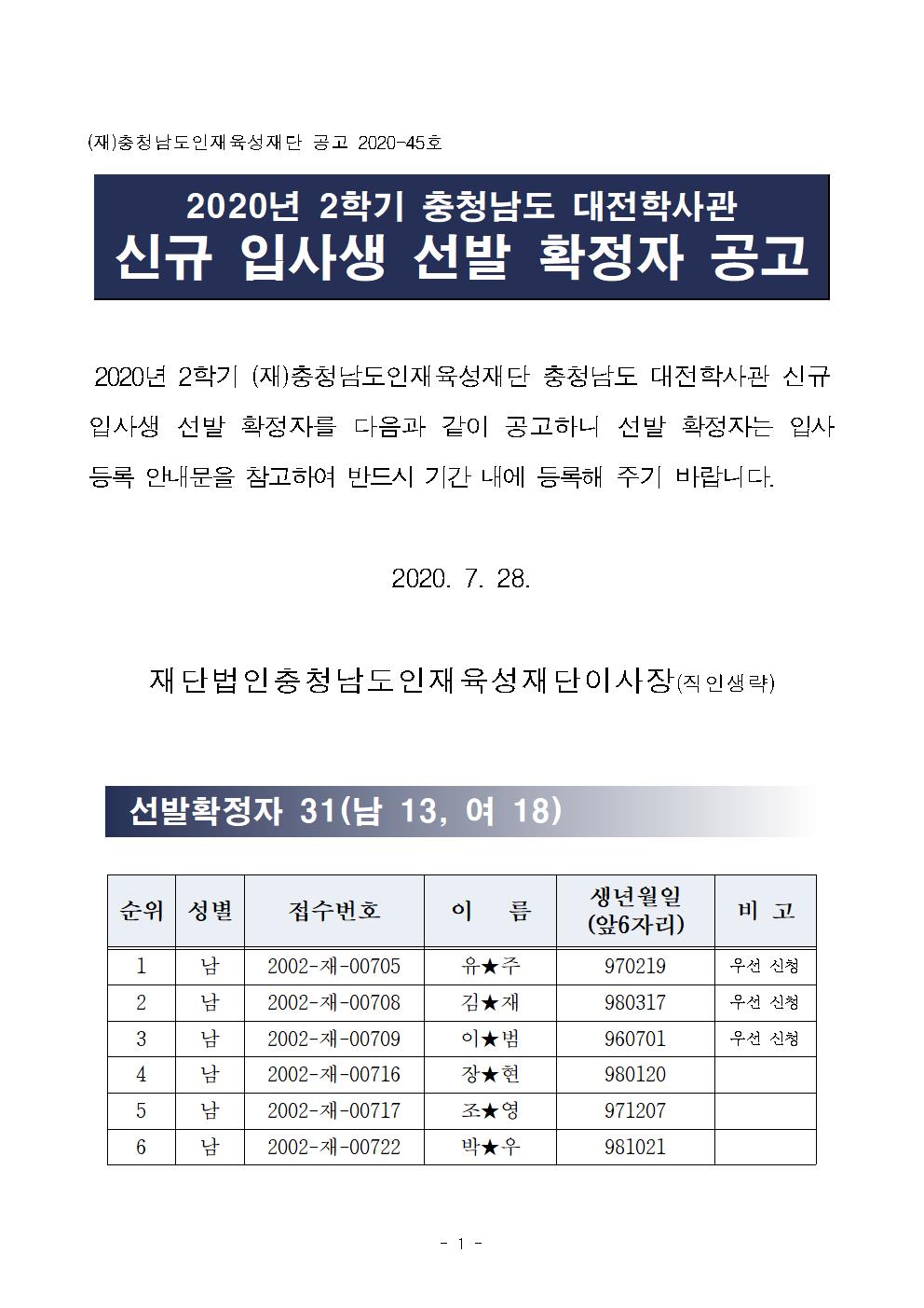 2020년 2학기 충청남도 대전학사관 1차 신규 입사생 선발확정자 공고문(홈페이지)001.jpg