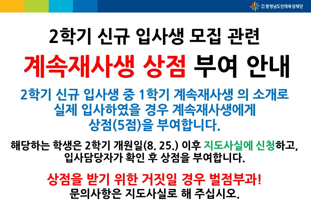 <알림> 2학기 신규 입사생 모집 관련 계속재사생 상점 부여 안내