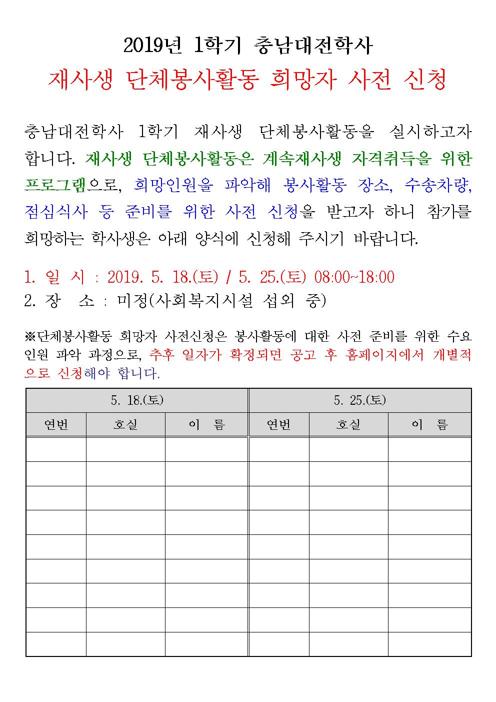 (알림) 2019년 1학기 재사생 단체봉사활동 참가 희망자 사전 신청