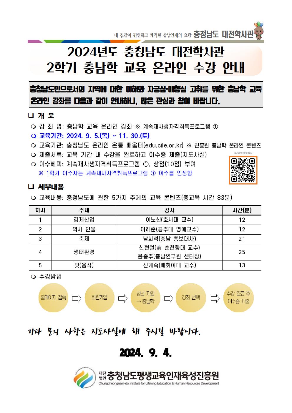 2024년도 충청남도 대전학사관 2학기 충남학 교육 온라인 수강 안내.jpg